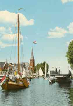 Een ansichtkaart met een zeilboot voor de draaibrug. Op de achtergrond naast de